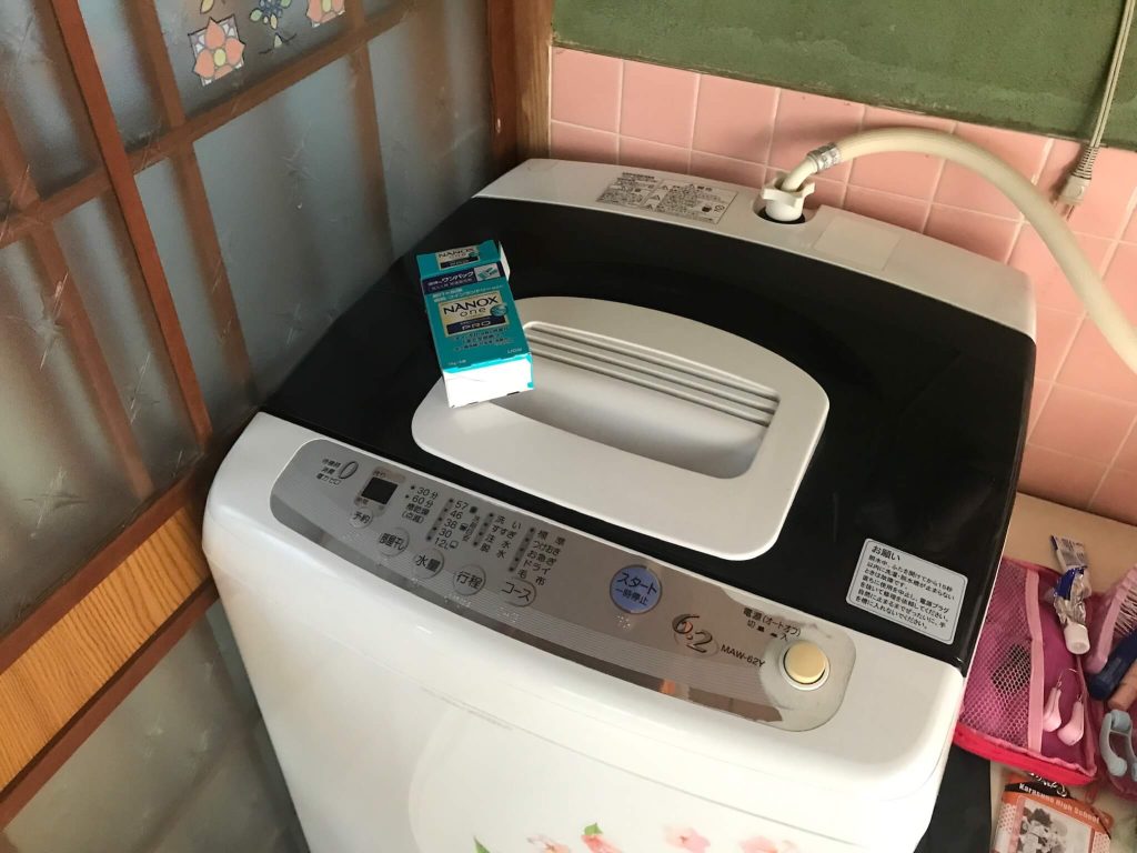 洗濯機には乾燥機は付いていません。あと、洗濯洗剤もないのですが、近所のドラッグストアにトラベル用洗剤が売っているので問題なしです。(洗濯機の上にある箱が購入した洗剤です。一回ずつ個包装で便利です)浴室には浴槽もあり、トイレも独立しています。昔ながらのお家なので全体的に広々しています。