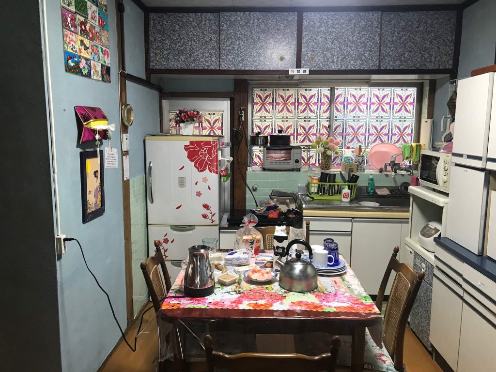 こちらがダイニングキッチン。調理器具と食器類の他、炊飯器やトースター、電子レンジ、ケトルまであります。調味料はありませんが、食器洗い洗剤とスポンジ、ラップはありました。
